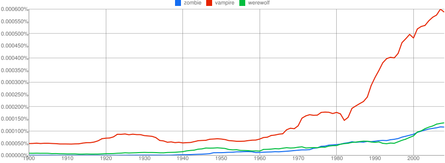 And here we can clearly see the impact of Anne Rice and her Lestat as the progenitors of the vampire craze. Vampires are clearly the monster of last thirty years, and by 2008, they still have nothing to fear from either werewolves or zombies.