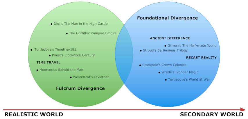 The other end of the spectrum are foundational divergences. Typically used in more fantastical alternate histories, foundational divergence occurs so far back in the story’s timeline that its effects percolate through all aspects of the world. The place names, some of the personalities involved may be familiar to us, but they are already skewed relative to our timeline based on events that happened significantly prior to the events of the story.